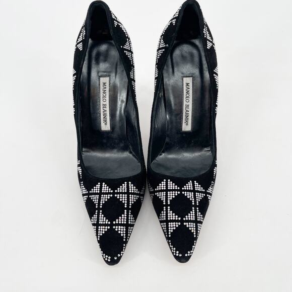 Striking Manolo Blahnik pumps in black suede adorned with crystal embellishments in a geometric motif. The pointed toe and slim stiletto heel create a refined, glamorous silhouette perfect for evening wear. Leather lining and outsole.
