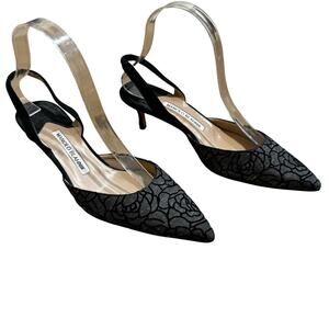 Manolo Blahnik Black Velvet Floral Slingback Heels Textured Fabric Pumps EU 37.5
