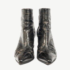 Made in Italy, these booties from Manolo Blahnik are crafted in a brown eelskin, and feature covered stiletto mid-heels, closed pointed toes, back zip closures, and leather lining and soles.