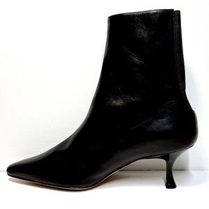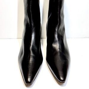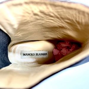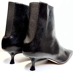 Manolo Blahnik Kitten Heel Leather Ankle Boots. Solid dark brown calfskin uppers. Women's size IT 38 US 8. Pull on entry, elasticized panels at back of shafts. Pointed toes. Shaft Height: 6" Leg Opening: 8" approximately 2.25" stacked kitten heel heights. Very good pre-owned conditions with no significant signs of previous use. Faint creasing, scuffs and minor indoor wear to outsoles. These were worn twice indoors. No box, No storage bags, No extras.
