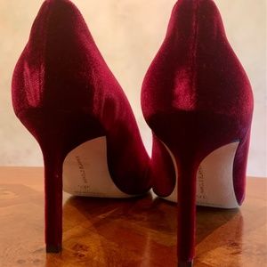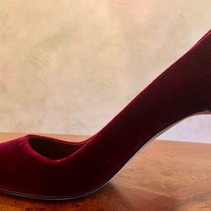 Manolo Blahnik burgundy pumps, size 37 EU. Crisp premium velvet with minimal detail. 3.7/8” block heel. New condition, never been worn, NIB.