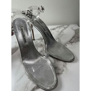 Manolo Blahnik, clear sandals, PVC heels, silver sandals, designer footwear, luxury shoes, women's sandals, evening shoes, Manolo Blahnik heels, stylish sandals