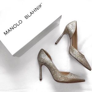 Manolos Blahnik Collina Pump in glitter in a 6.5. Worn once, excellent used condition. Wear on soles. Available with box. Selling because it was a gift and the shoes are too big for me.