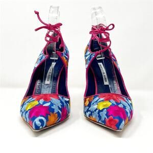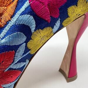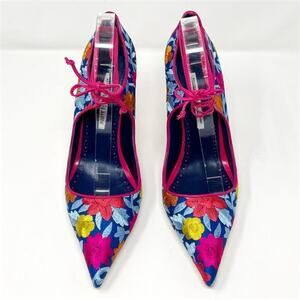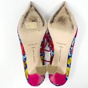 Manolo Blahnik Cotis Floral Embroidered Pumps 39.5 Blue Pink Heels