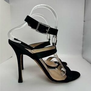 Manolo Blahnik Crystal Buckle & Ring Black Suede Open Toe Sandal Heel - Size 38