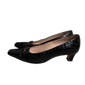 Gorgeous pair of black crocodile 2” kitten heels. Toe has a slight point, with tiny buckle across top, a window of toe cleavage, then squares off at tip. The heel has a unique curve to its squared off shape.