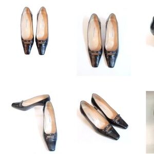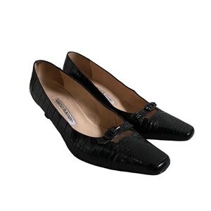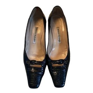 MANOLO BLAHNIK Vintage Cutout Buckle Black Crocodile 2” Kitten Heels. Size 38. Made in Italy.