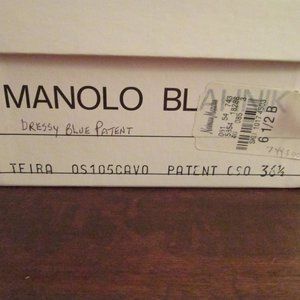 Manolo Blahnik navy patent leather peep toe 6 1/2B, stiletto heels with a rhinestone tiny ball, gorgeous. These shoes are in excellent condition with minimum wear on the outsole. They were bought at Neiman Marcus for 695 in the early 2000s. They measure 10 1/2" from toe to heel and 5 1/2" at the widest point.