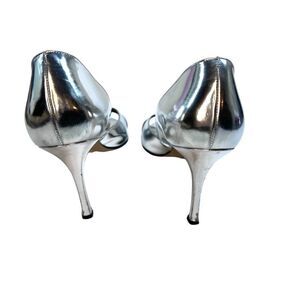 Manolo Blahnik Silver metallic heels size 40. Preowned with a leopard fabric lining. They do show signs of wear on the inside but not on the outside. Step out in style with these elegant silver peep-toe heels. Perfect for any occasion, these shoes add a touch of sophistication to your outfit. Smoke free. Great for homecoming, prom, cruise, wedding, holiday party, Christmas, New Years Eve, winter formal.