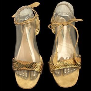 These Manolo’s are the perfect Go-To sandal for your summer wardrobe! The embossed snakeskin leather is black, tan, gold and bronze, which will go with everything. It features a beautiful 2” stacked wood kitten heel and a leather ankle tie closure with leaf detailing. The tie is long enough to wrap around and tie in the back, or tie in the front (as shown in photos). These were only worn a few times, so they are in great condition. Made in Italy, Size 41.