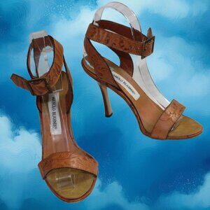 Manolo Blahnik Embossed leather Ankle Wrap Peep Toe Stiletto Sandal Size 36.5