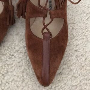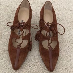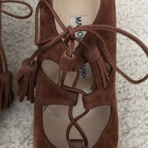 Brown Manolo Blahnik suede pumps with leather trim and ties.. 3 inch sculpted heels. There is some scuffing and natural color variation inherent in suede. Worn twice. The original dust bag will ship with the shoes, but there is no box.
