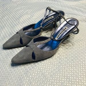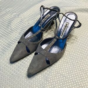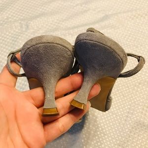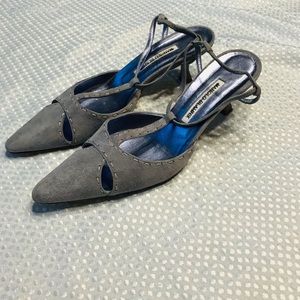 Elegant gray heels with pointed toe. Features a unique cut-out design. Perfect for any occasion.
