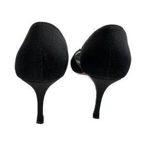 Manolo Blahnik Hangisi black satin d’orsay heels with signature crystal button.