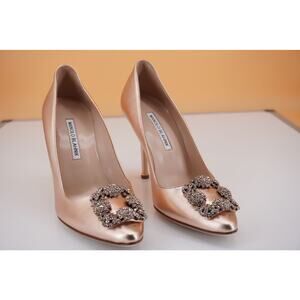 MANOLO BLAHNIK HANGISI JEWELED 90MM PUMPS SZ 37.5 COPPER LEATHER $1245 NEW