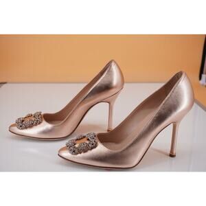Manolo Blahnik Hangisi Jeweled 90mm Pumps Sz 37.5 Copper Leather $1245 New