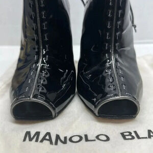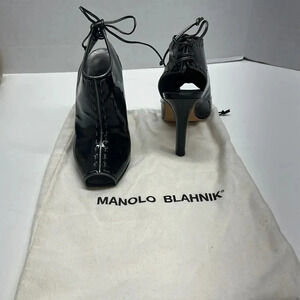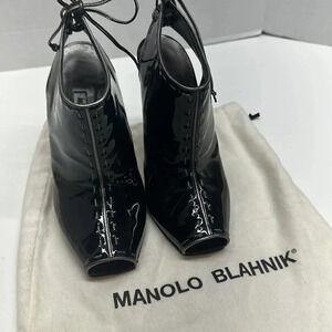 Manolo Blahnik Heeled Bootie Black Patent Leather Peep Toe Lace Up Back Heels 37