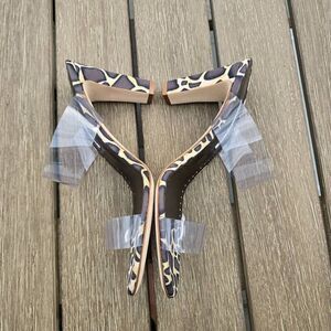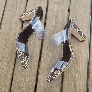 Its light, it gives a lot of leg, and its barely there!" - Manolo Blahnik Clear PVC sandals featuring slip-on design, two front straps and a beautiful leopard-print pattern with a block heel. Upper: 50% PVC, 50% kid suede. Sole: 100% cow leather. Lining: 100% goat skin. Heel measures 90 mm.