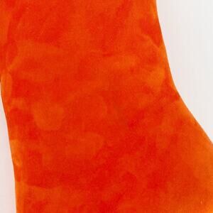 Orange suede pointed toe knee high boots featuring side zip closure and block high heel.