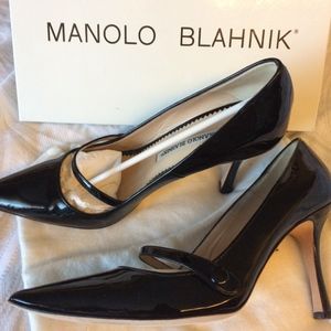 Manolo Blahnik Mladari black patent leather shoes in excellent condition, size 38 (pls know your European size). Leather upper, lower and sole and similar in style to the Mary Janes.