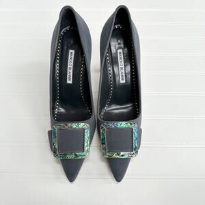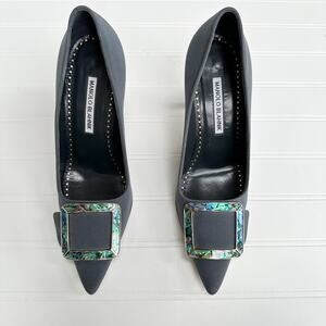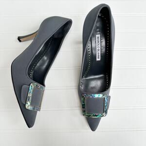 Manolo Blahnik Maysale Buckle Enamel Pump Crepe de Chine Silk Grey Heel