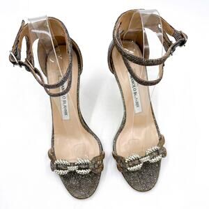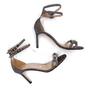 Manolo Blahnik Menia Sandals Silver Shimmer Crystal Ankle Strap Heels 35.5 / 5.5
