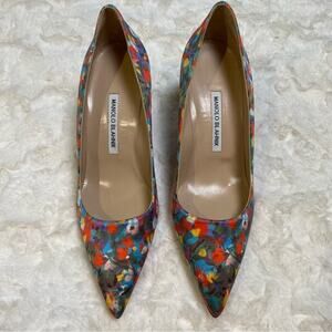 Manolo Blahnik Multicolor Floral Print Satin Pointed Toe Pumps Heels Size 39.5