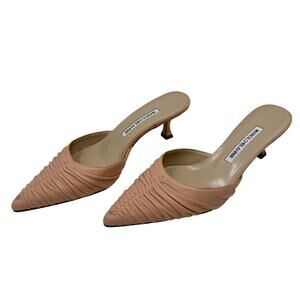 Keywords: Manolo Blahnik mules, ruched leather heels, nude kitten heel, designer slip-on shoes, classic pointed toe, Italian luxury shoes