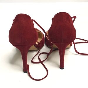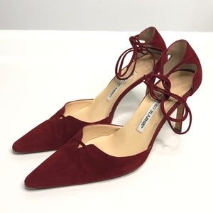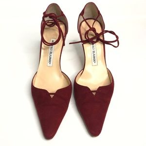 Manolo Blahnik Oxblood Red Suede Ankle Tie Up Heels