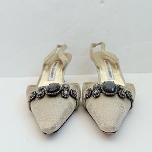 Manolo Blahnik Pale Gold textured floral Rhinestone Carolyn slingback pumps EU39