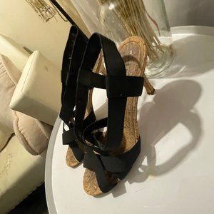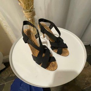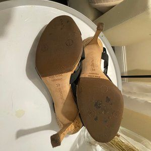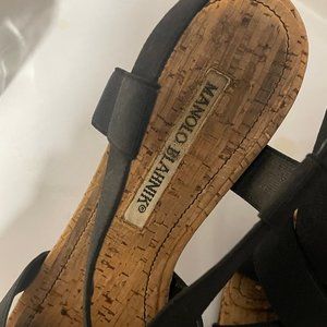 Manolo Blahnik Perpia Strappy Stretch Brown and Cork Sandals are a size 37. The heel measures approximately 3.5". The cork is very pretty with some flecks of gold sprinkled throughout. The shoes were made in Italy.