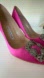 Hot pink satin almond toe pumps featuring a square crystal buckle encased in a gunmetal frame. Finished with a stiletto high heel.