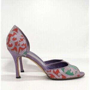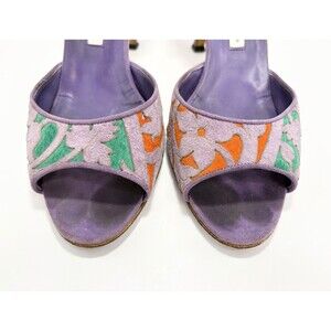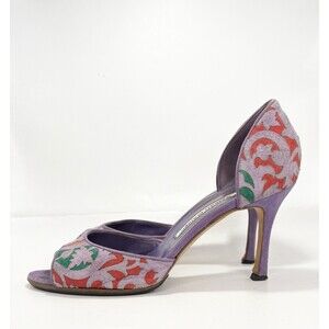 Manolo Blahnik Purple Suede Heels w/ Orange & Green Laser Cut Floral Sz 37.5 7.5