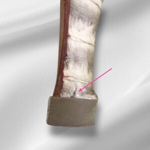 Has a small very minor tear at bottom of heel (see arrow in photo)