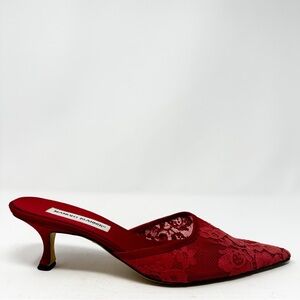 Manolo Blahnik Red Lace Kitten Heel Slip On Mules Size 40
