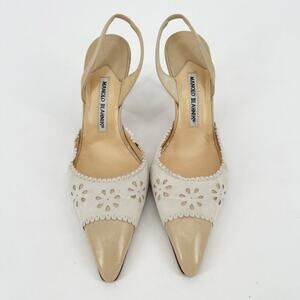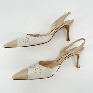 Manolo Blahnik Retro Floral Eyelet Beige Pointed Cap Toe Slingback Heel IT 40