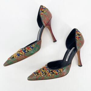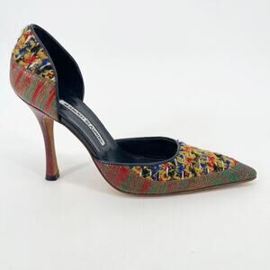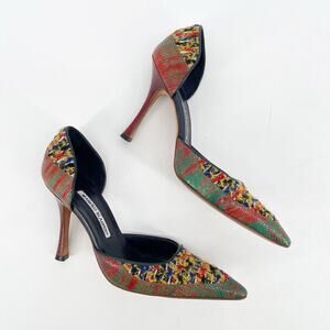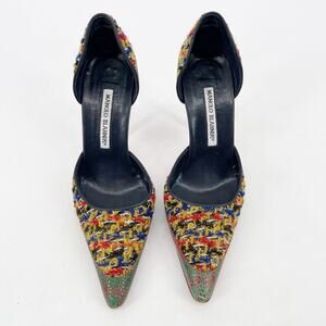 Manolo Blahnik Retro Multicolor Bouclé Lizard Leather Trim Pointed Toe D'Orsay Pump IT 37