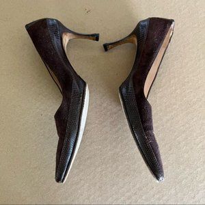 Manolo Blahnik Suede Croc Pointy Toe Wood Stacked Heels