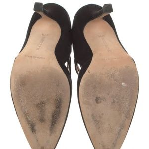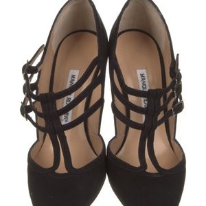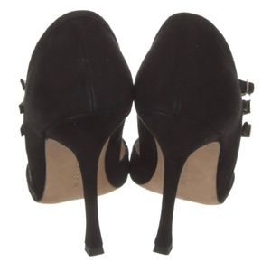 Only worn once; black suede pumps; great condition-some wear on soles; semi pointed heels; multi strap and buckle closure; includes dust bag.