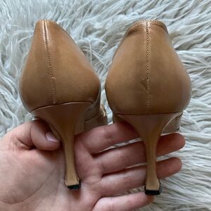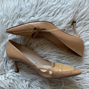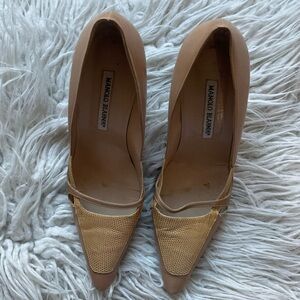 Manolo Blahnik Tan Leather Snake Embossed Panel Pointed Toe Pump Heels Size 39.5