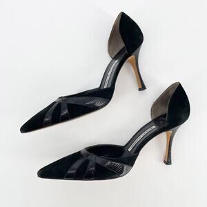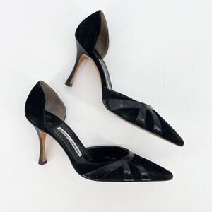 Manolo Blahnik Vintage Black Suede Lizard Trim Pointed Toe D'Orsay Heel IT 37.5