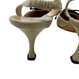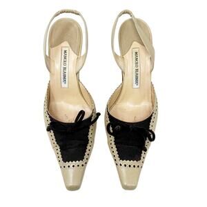 Keywords: Manolo Blahnik Heels, Vintage Designer Shoes, Brogue Slingback Pumps, Two Tone Kitten Heels, Y2K Manolo