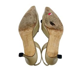 Chic and sophisticated vintage Manolo Blahnik two-tone slingback heels, featuring intricate brogue detailing, a pointed toe, and a low stiletto heel for elegant wearability. Crafted in Italy from supple beige leather with contrast black suede paneling and petite velvet bow accents — a classic Manolo silhouette with vintage charm.