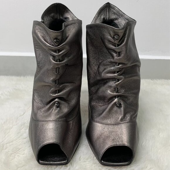 Manolo Blahnik Women's Pewter Silver Peep Toe Ruched Stiletto Booties Size 38.5