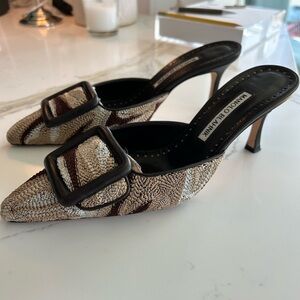 Chic woven Maysale mules by Manolo Blahnik. Features a bold buckle accent.