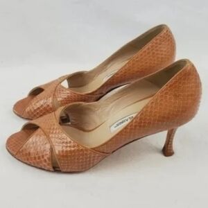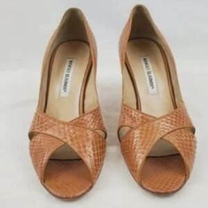 Manolo Blahnik tan leather peep toe heel pumps size 38.5