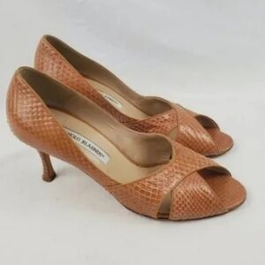 Elevate your style with these elegant Manolo Blahnik peep-toe heels. Crafted in a sophisticated tan color, they offer a chic and timeless look for any occasion.