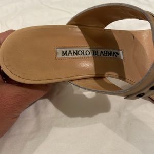 Manolo Blahnik women’s nude leather with brass metal studs and a 3 in wood stacked narrow kitten heel mule sandal & they have a leather sole. My feet grew after having children 😢