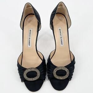 Manolo Blahnik Black Satin Sedaraby Crystal D’Orsay Peep Toe Heels IT 39