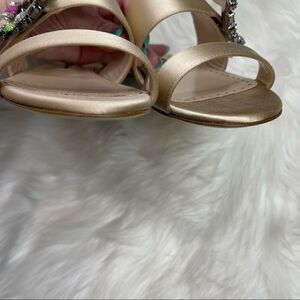 •Features: Beige/nude satin sandals with multi-color jewel encrusted buckle. Open toe slip on style. One dust bag included.